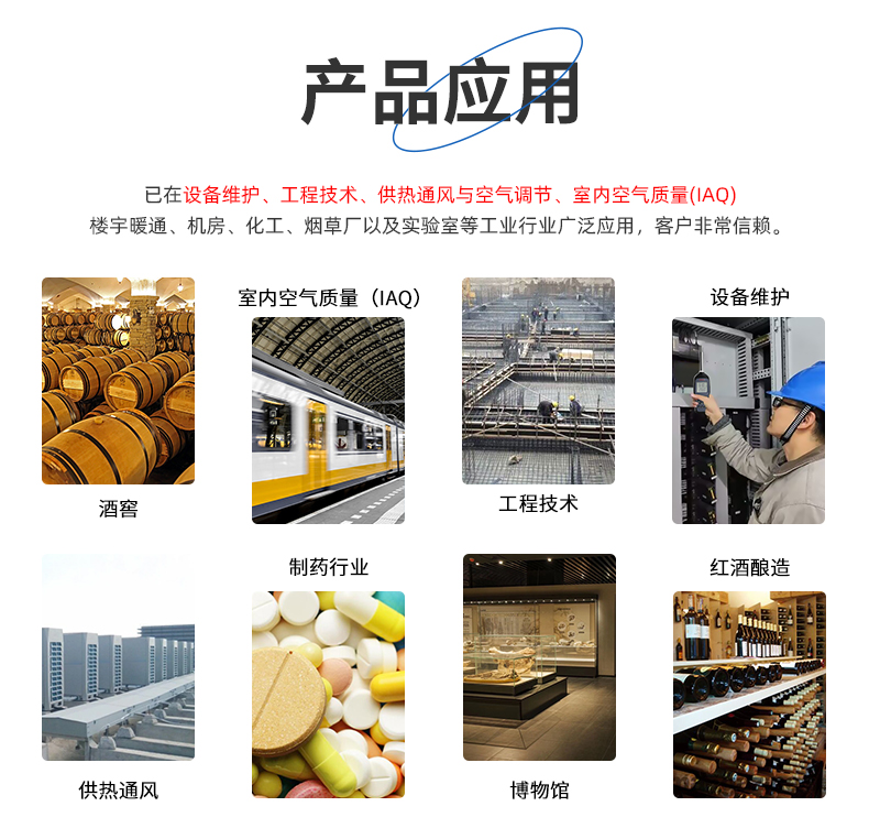 廣泛應用于:半導體行業、潔凈房、科研、衛生檢疫、比對標準、設備維護、供熱通風、室內空氣質量(IAQ)等領域。